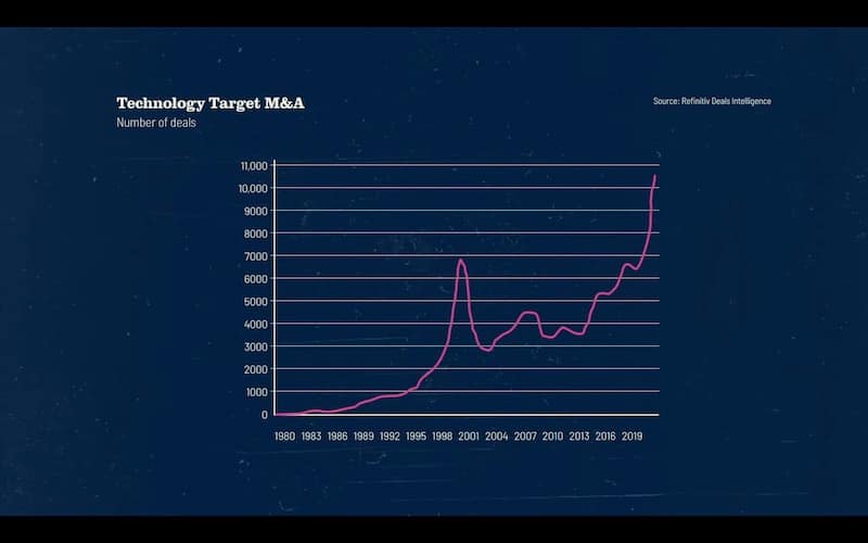 Um, but this is going to well over 10,000 transactions, uh, and just the first nine months of 2021 alone. And if you were to broaden it to the global M and a landscape, not just technology, we’ve seen over 45,000 different acquisitions. This is up over 24% from last year, which is already a huge year and represents $3.6 trillion of different mergers and acquisitions.