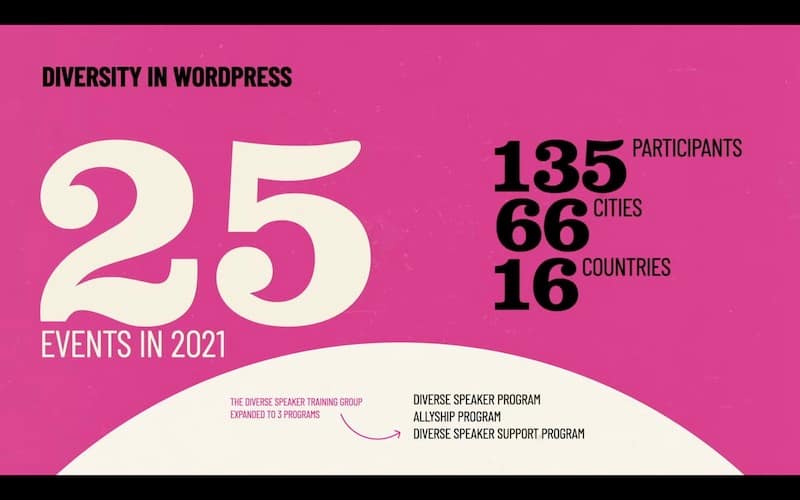 So this is widely accessible as possible. And speaking of that, there’s also been some exciting developments around diversity and WordPress. So we created this new diverse speaker program and speaker support program that have had 135 participants go through it so far and 66 cities and 16 countries around the world.