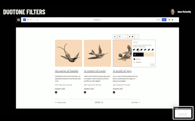 And finally, one of the things that we’re still not sure how to describe exactly, but we’re very excited to be part of the design tools of WordPress is duo tone filters can be used in even more places like the featured image block. It’s a great way to bring character to your photos and perhaps in the future, your videos, this means you can transform your images without touching any code or photo editor.