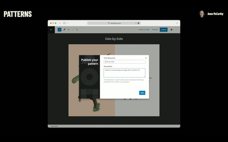 The word pattern directory, similar to the plugin and theme is a site that features submitted patterns that anyone can copy and use with WordPress 5.9 we’re preserved members will be able to sign in and submit patterns, be added to the directory. As you can see in this flow, this is a huge opportunity for desire to contribute to the overall WordPress ecosystem, without having to know how to code plugin or a theme.
