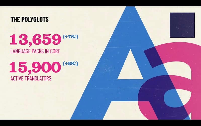 Another thing. I was really, really proud about our progress in 2021 was what we call the polyglots. If you don’t know, polyglot is a word for someone who speaks a lot of languages, I speak barely one. So these folks always impressed me quite a bit. Uh, we had a 76% improvement and the language packs that are being created for plugins and core.