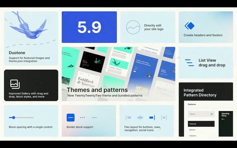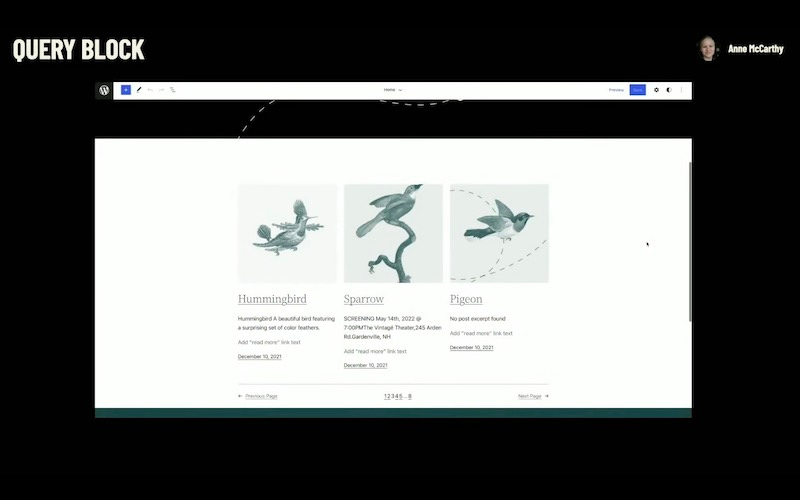 We’ve got a few demos here of what’s in 5.9, and these are honestly some of the coolest demos we’ve ever shown in the state of the world. The 5.9 release marks the introduction to the next generation of themes that allows greater customization and simpler building themes can now be created entirely with blocks, meaning you get all the familiar editing tools and the same blocks you use when creating posts and pages to allow you to edit all parts of your site, including your header and footer.