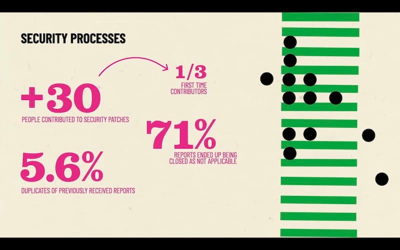 We had over 30 people of which a third of them were first time contributors contributing security patches in our security reporting system. 71% of the reports ended up being closed as not applicable and about five points has produced look at. So this means that someone had reported them already.